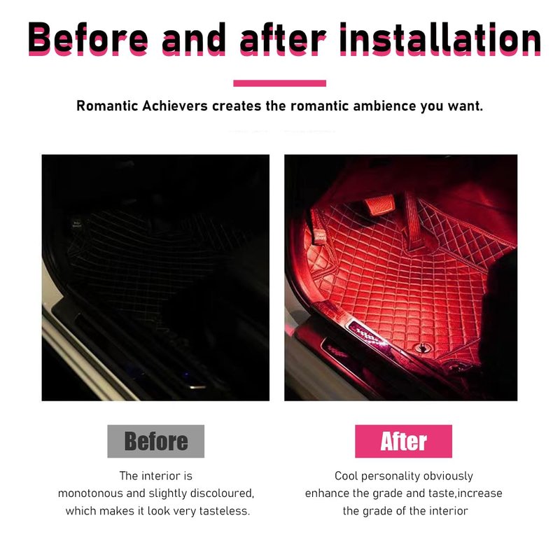 - 【Decorative Effect】: This car ambient light is rich in color, which will create a romantic and fun atmosphere for your car at night. It can also help you find things easier in the dark. It has soft lights that will decorate your car's interior well. The excellent decorative effect can greatly improve your driving pleasure.