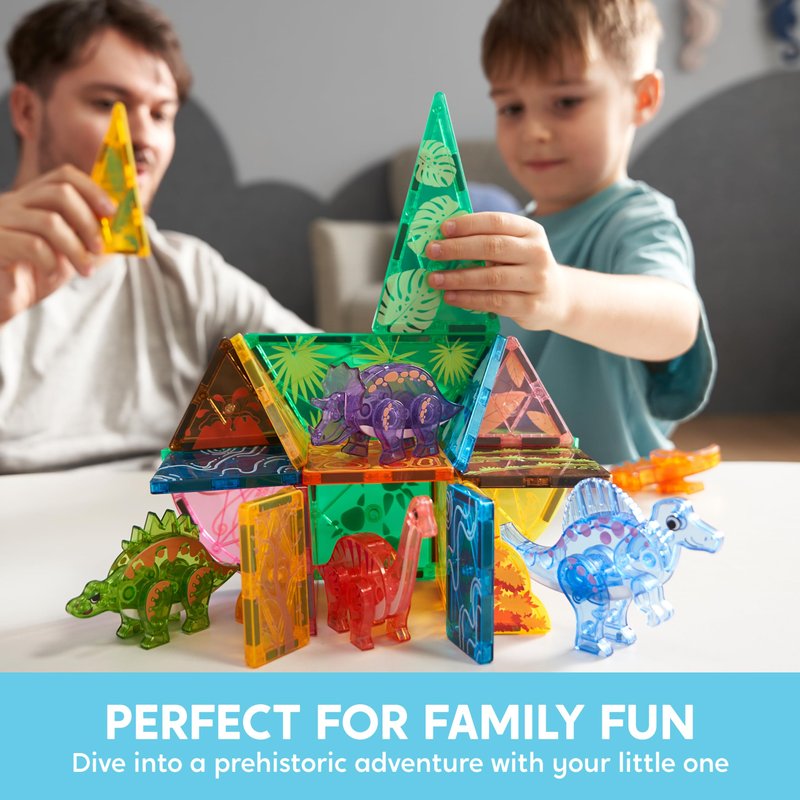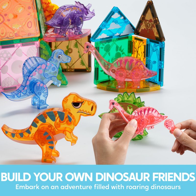 - Rich Accessories: Includes 50 pieces, featuring T-Rex, Spinosaurus, Triceratops, Stegosaurus, and Brachiosaurus. The diverse magnetic building tiles and dinosaur figures inspire kids' imaginations, allowing them to create and customize various dinosaur landscapes.