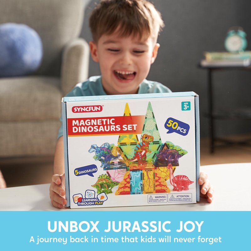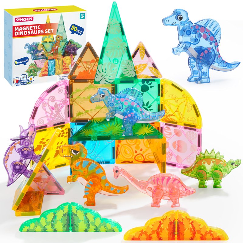 SYNCFUN Magnetic Building Tiles Dinosaur Set for Kids, 50PCS Including 5 Cute Dinosaurs, Educational STEM Toy for Boys & Girls Ages 3-5 4-8, Christmas Birthday Party Gift for Toddlers