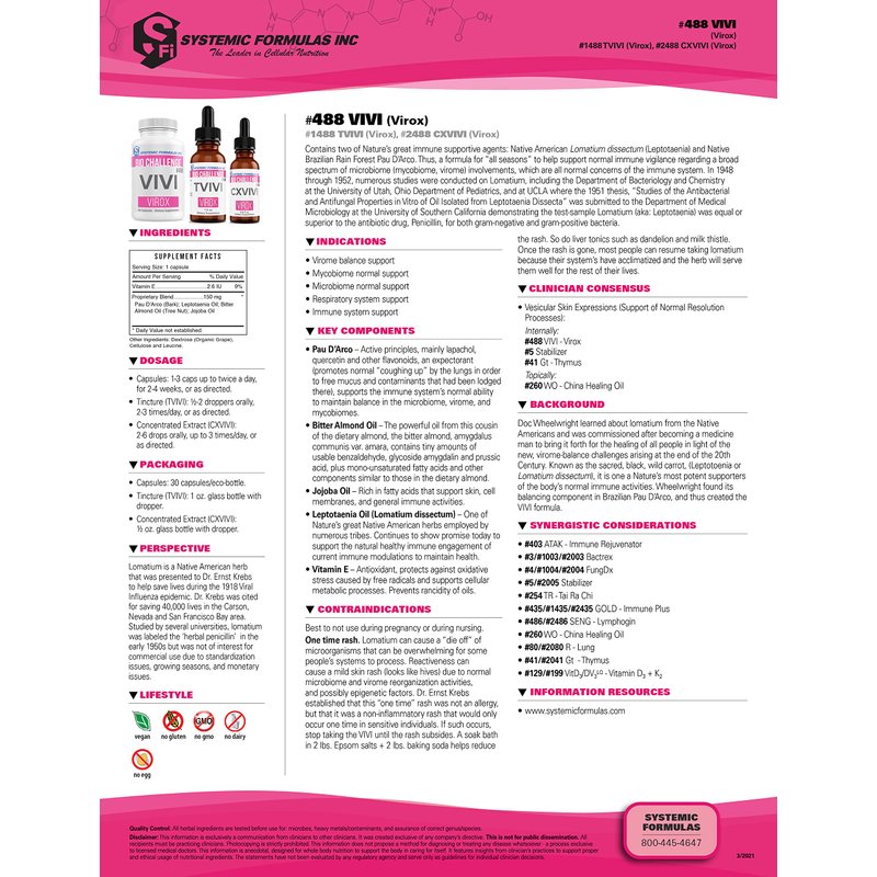 Systemic Formulas Bio Challenge #488 VIVI Virox - 30 Capsules. Powerful Immune Support Blend with PAU D’Arco, Leptotaenia Oil (Lomatium dissectum), Bitter Almond Oil, Jojoba Oil and Vitamin E.