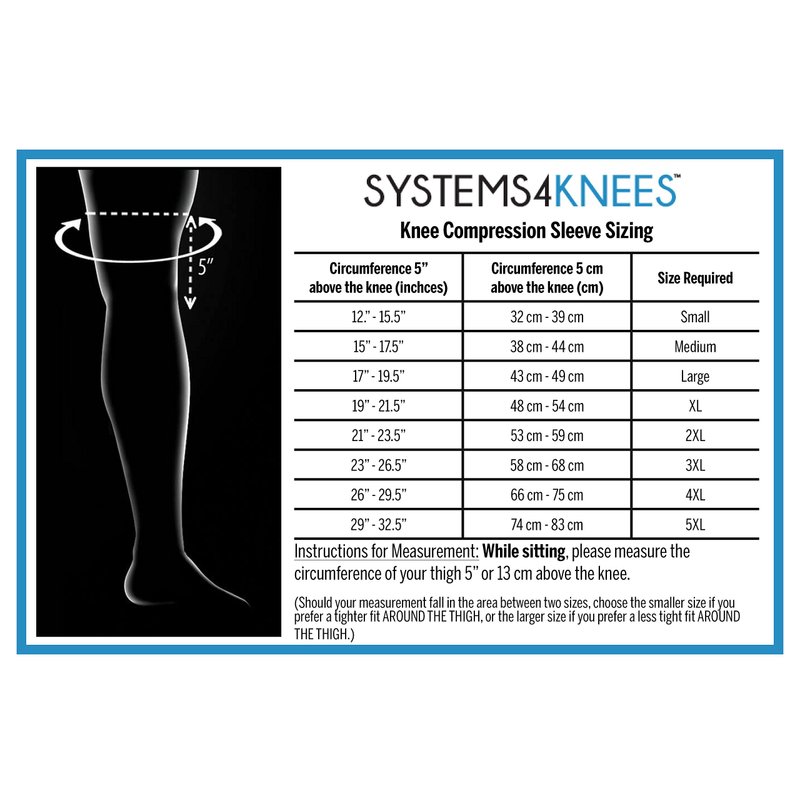 The Systems4health Compression Sleeve has been developed by a leading orthopedic knee surgeon, Dr. Gregory M. Martin, and Bob Habib, RPT, a prominent physical therapist with over 30 years treating knee problems. The lightweight design and special materials provide support for your knees when you need it most. Available from Small through XXX-Large. (SEE SIZING CHART PHOTO)