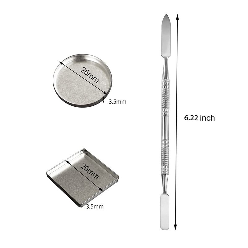 - Package includes 50pcs Round Makeup Palette Pans (diameter:1 inch) +50pcs Square Makeup Palette Pans(Length:1 inch)+1pcs depotting spatula(6.22 inch)