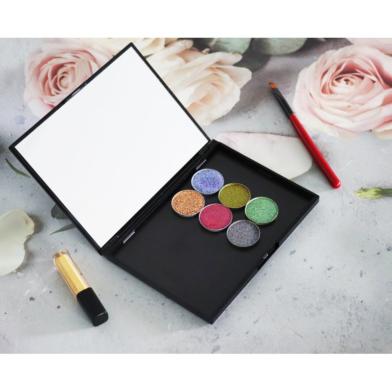 You can pack your eyeshadows, highlights, blush, baked powders, bronzer or foundation pans in one portable magnetic palette, very convenient for travel carrying