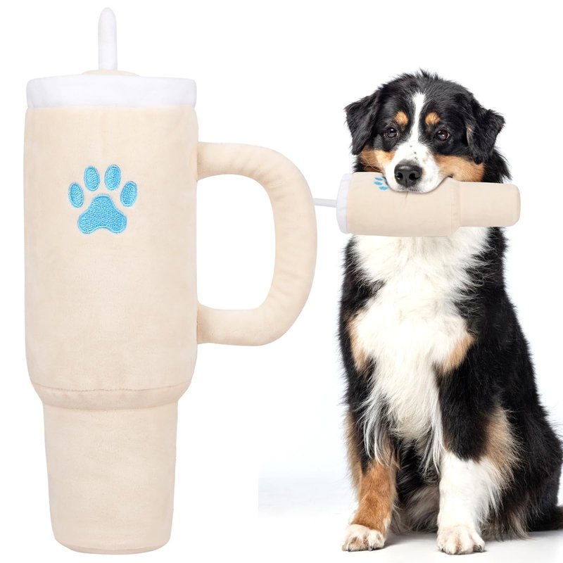 SZEE Insulated Cup Dog Toy, Funny Squeaky Toy for Chewers, Interactive Cute Plush and Stuffed Toy for Medium and Small Dogs, Perfect for Dog Birthday Gifts (40 oz, Apricot)