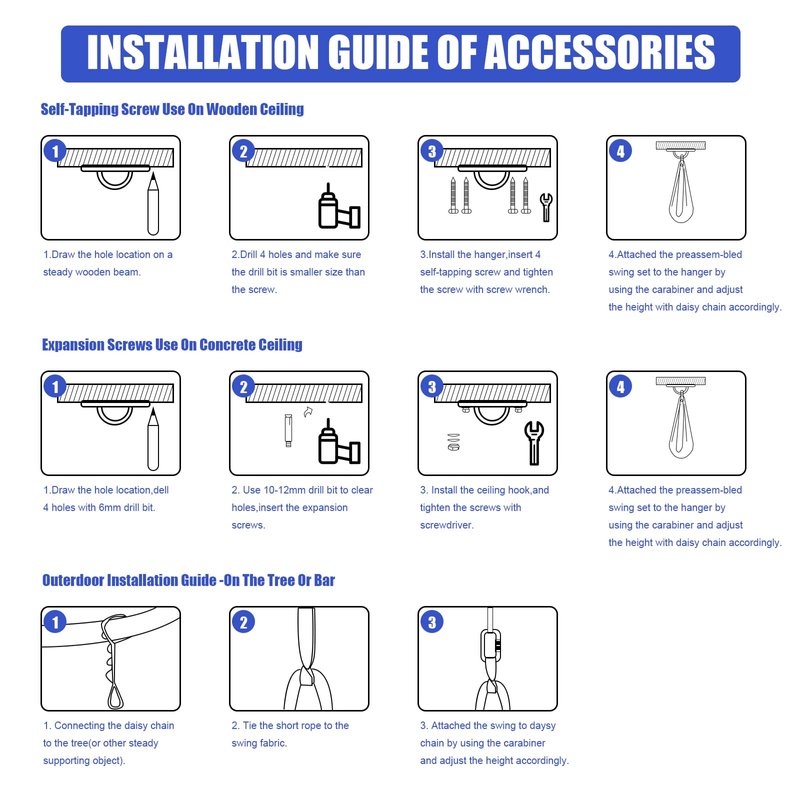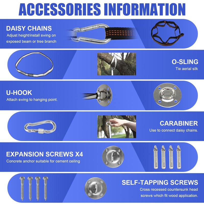 - EASY USE:This indoor sensory swing comes with extra accessories,including daisy chain,O-sling,carabiner,U-hook,expansion screws x4 and self-tapping screws x4.And you can refer to the installation video or the instruction which is attached with the product,so that the installation will be very easy.