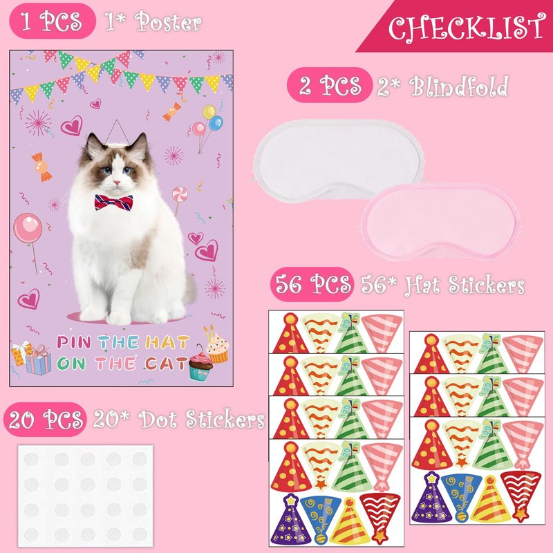 - Package Include: 1pc Cat Party Game poster(28''x21''), 2pc blindfold,56 Reusable Hats Sticker, 20 dot stickers. Reusable Stickers can support many people to play pin games together at parties.