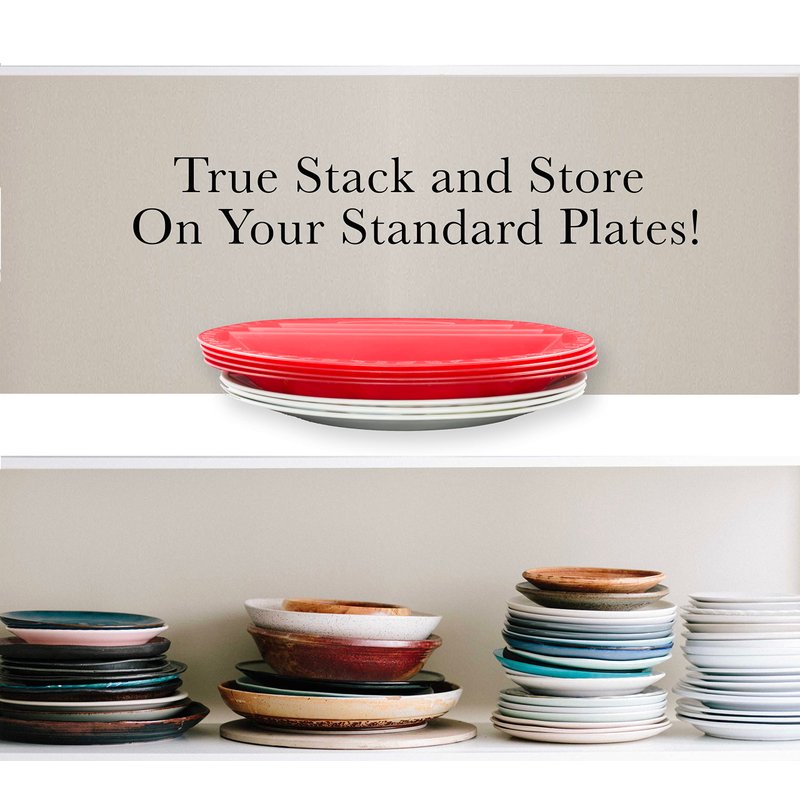 - Patented Round Plate Design Stacks to store even on Standard Dishes for storage