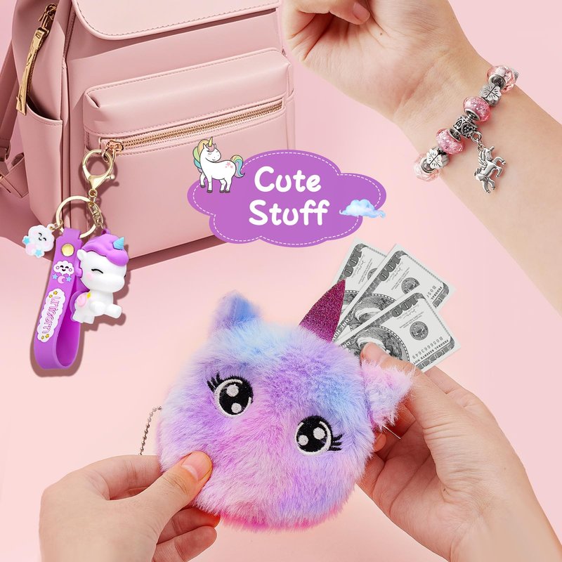 - KAWAII ACCESSORIES - Your girl goes to school with a cute fluffy unicorn purse in hand, wearing the unicorn charm bracelet on wrist, carrying a backpack with a lovely unicorn key chain. Her friends will be very envious when they see it. The surprise toys for girls are unique gifts for kids. You can imagine the big smile on her face the first time she open her unicorn gifts full of cute stuff for girls. This will like a diamond in her memory, that will shine in her heart even after many years