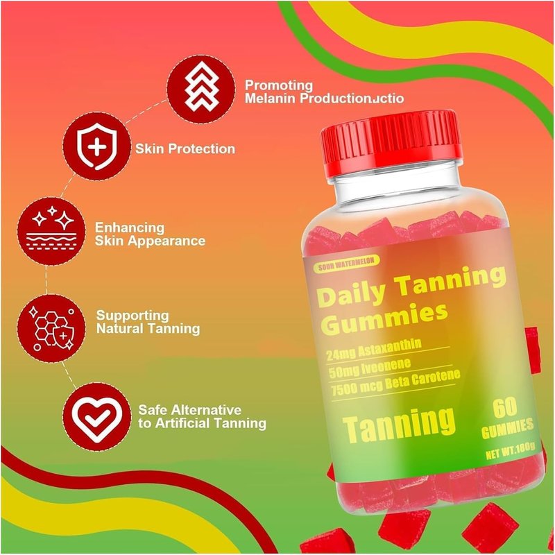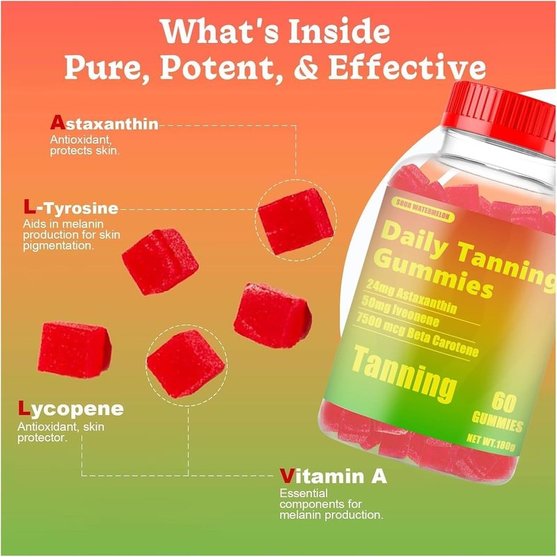 - Daily Tanning Support: These gummies provide a lasting tan and combat free radicals with Astaxanthin and Lycopene, promoting youthful, vibrant skin. Ideal for maintaining a healthy tan and protecting skin health.