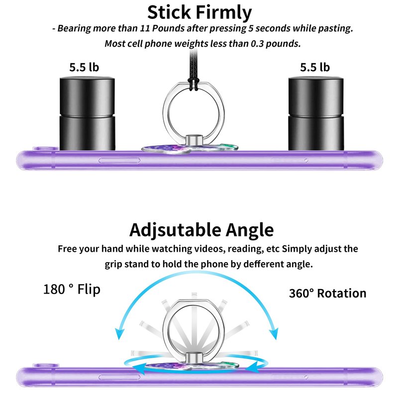 - Grip Features: Used as a holder grip holds devices firmly, preventing devices from dropping. As a cell phone finger holder kickstand, 360°Rotation & 180° flip adjusting your phone, free hands to watch videos.