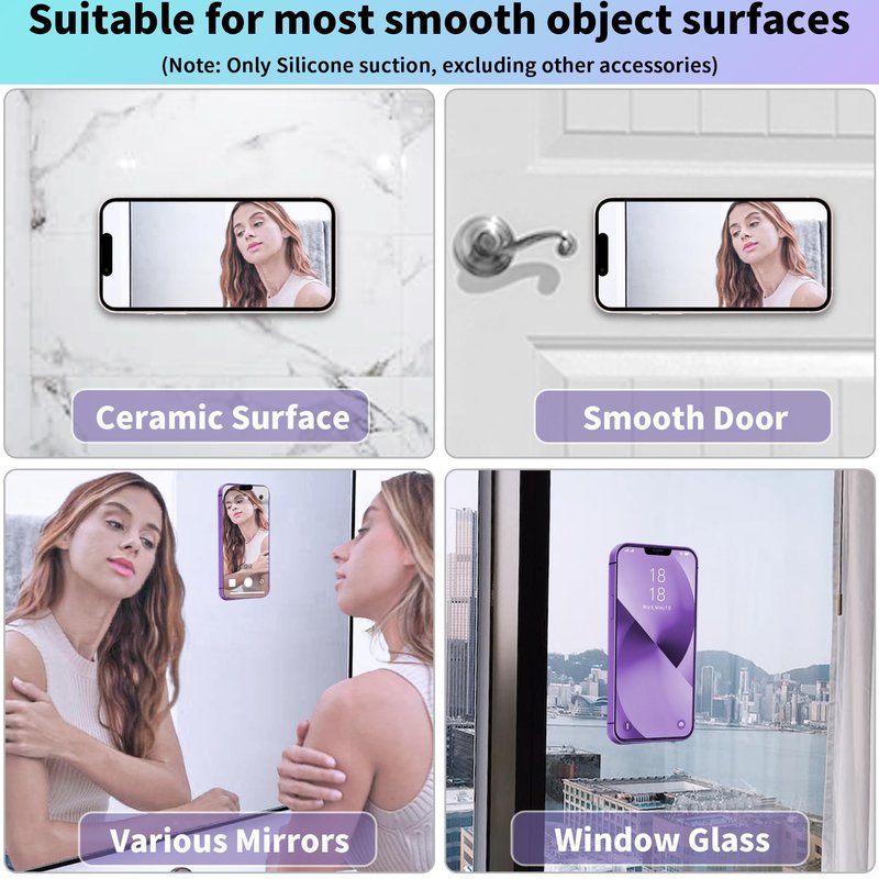 - Product Function: This is an innovative suction cup phone holder that allows your phone to be attached to a smooth bathroom, mirror, refrigerator, or window for taking photos or watching videos