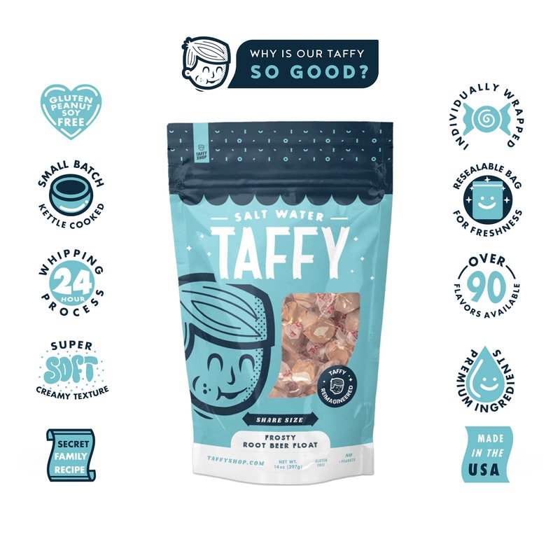 Taffy Shop Frosty Root Beer Float Salt Water Taffy - Small Batch Salt Water Taffies Made in the USA - Super Soft, Sweet, Taffy Candy - Guaranteed Fresh - Gluten-Free, Soy-Free, Peanut Free - Share (14oz) Bag