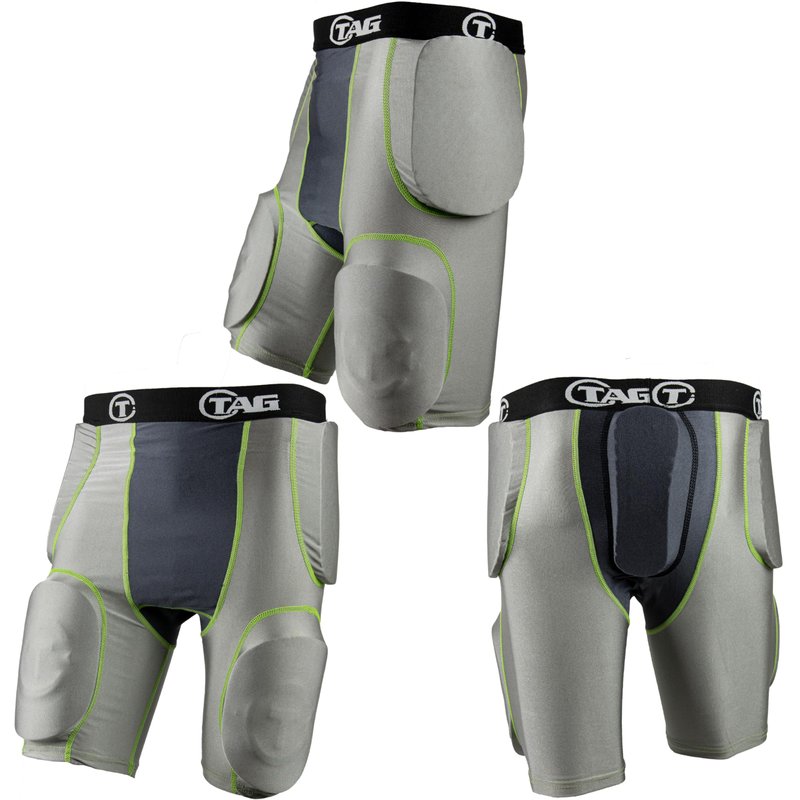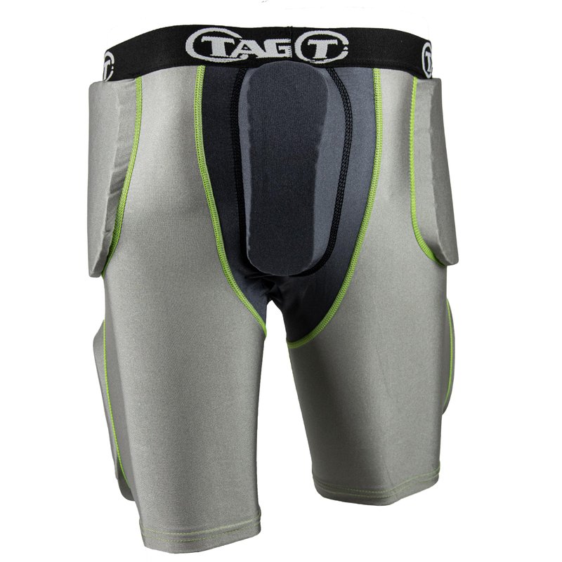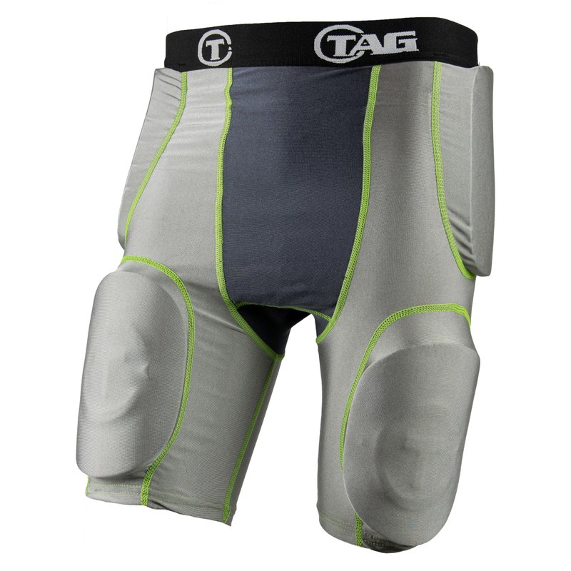 The Youth 5-Pad Integrated Girdle from TAG features moisture-wicking compression fabric in an 80% nylon, 20% spandex material to keep players cool and comfortable. 5 sewn-in hip, tail, and thigh pads provide maximum protection. Grey girdle with black elastic waistband with white lettering. Cup pocket. Thigh pads are 5-3/4" W x 6" L.