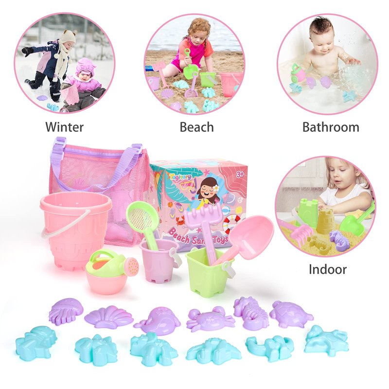 - TAGITARY BEACH TOYS FOR KIDS: Including 1 beach shell bag, 1 watering can, 2 beach bucket, 4 shovel tool kits, 12 animal sand molds like crab, turtle, shell, seahorse, jellyfish, dinosaurs, etc. Various accessories meet all needs of kids