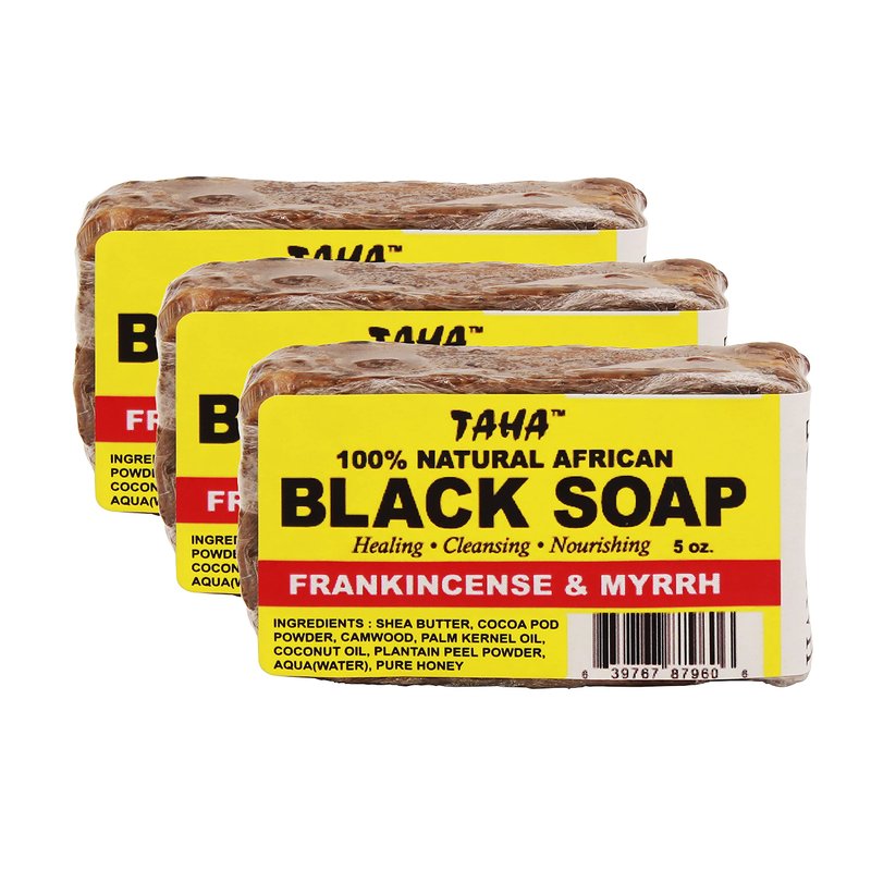 Taha African Black Soap Bar, Organic & 100% Natural, Soothing & Moisturizing, Healthy Cleansing – Great for Blemishes, Acne, Dry Scalp, and More, Natural Scent, 5 Oz (Frankincense & Myrrh, Pack of 3)