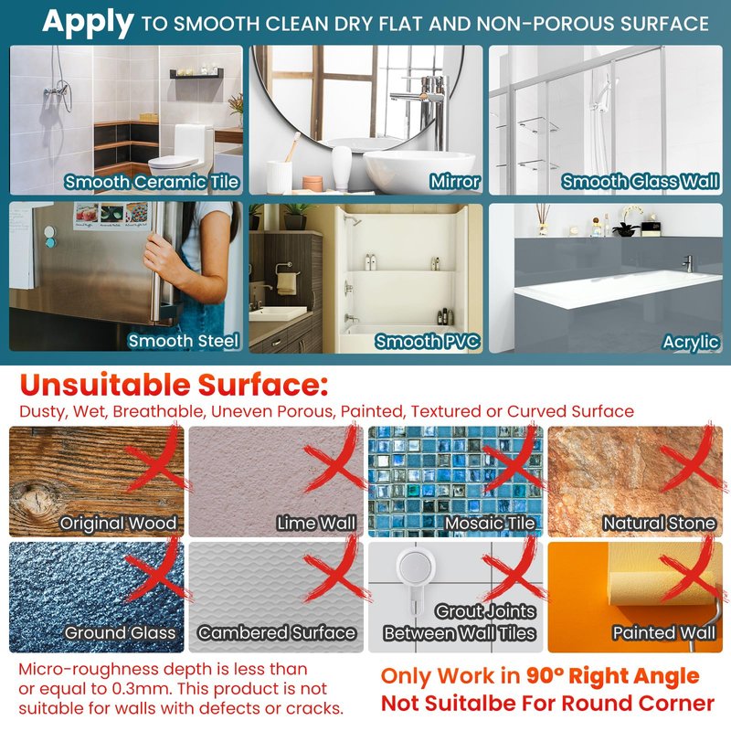 - Applicable Wall: ONLY work on tile (uncracked & smooth), glass, mirror, polished metal, stainless steel and acrylic. Don't stick to a grout line. NOT work on uneven tiles, texture plate, painted/dry wall, wood, wallpaper, rough/crack wall