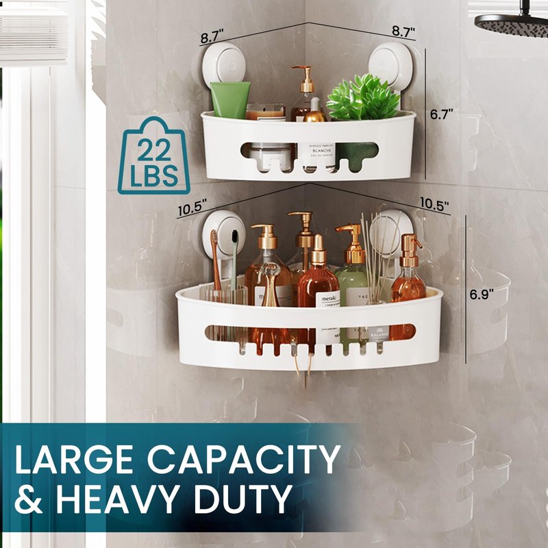 - DURABILITY & STRONG SUCTION: Corner shower caddy is made of premium thickened ABS material. Our suction cup based on the bionics octopus sucker principle is made of TPE material, which hold up to 22 LBS. The shower organizer suction is waterproof and oilproof so it can be used in bathroom and kitchen. Large shower caddy corner measures 3.3"H x 9.9"W x 9.9"L and small shower corner caddy measures 3.2"H x 8.7"W x 8.7"L