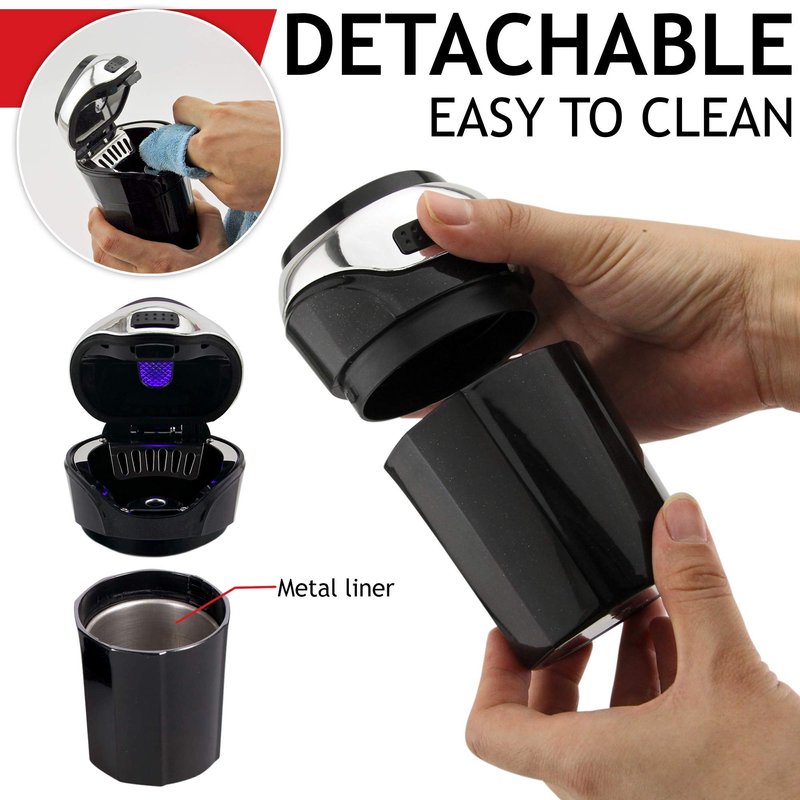 - DETACHABLE & EASY TO CLEAN: It's is portable car ashtray with a removable liner, easy to clean, good sealing performance and the smoke not easy to spread. Consists of two parts: the head and cup body, press the back button, take the cup off and clean the liner easily. It is an excellent protection for ashtray bottom.