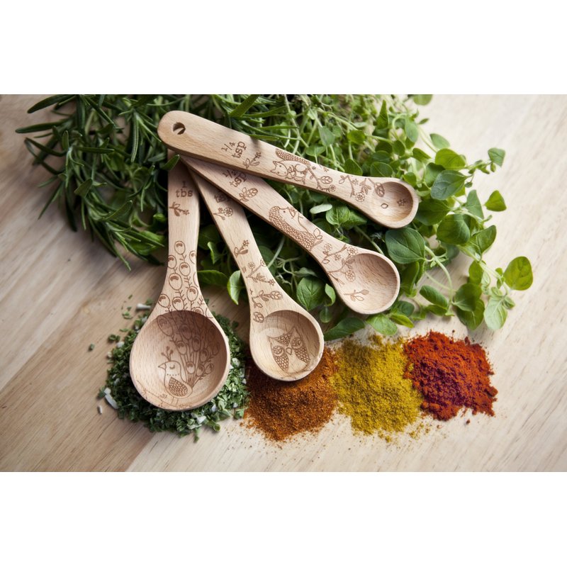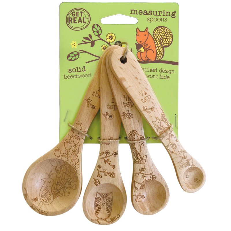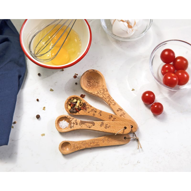 Talisman Designs Laser Etched Beechwood | Set of 4 | Woodland Design | Natural, Wooden Measuring Spoons Set| Cute & Functional Kitchen Tools