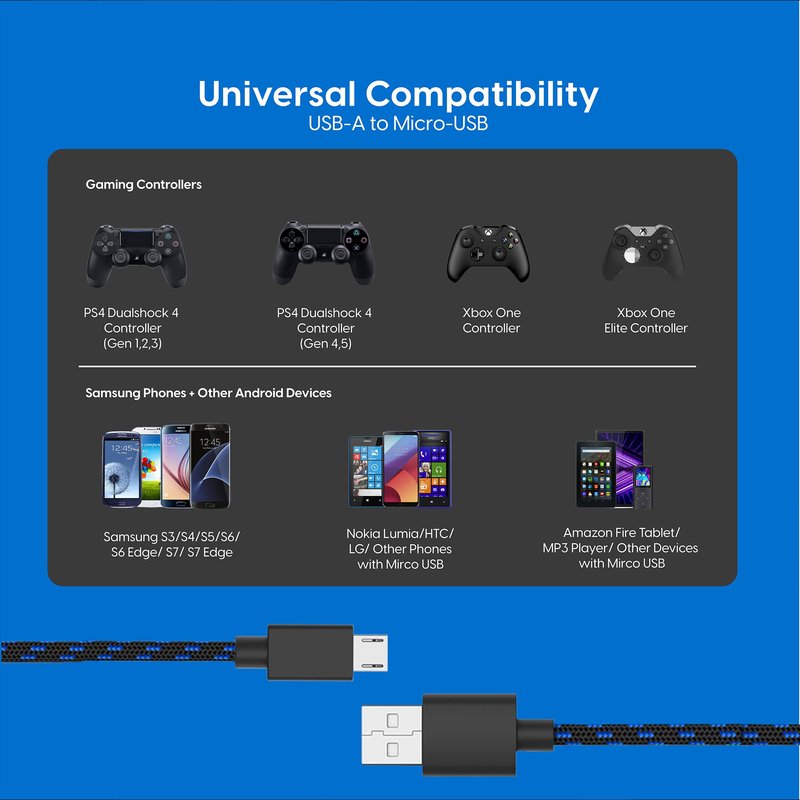 - Universal Compatibility - Our 10ft long USB cables are compatible with a variety of controllers including the PS4. It is a great complement to your PS4 accessories for easy charging and setup so you can focus on your game.