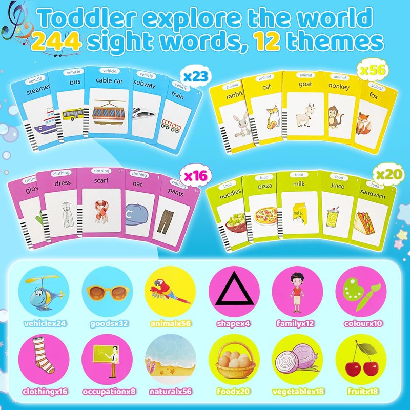 - ✨【Toddler Learning Toys】Talking flash card educational toy have 224 Sight Words covering 12 subjects like shapes, transports, food, fruits, vegetables,colors,costumes,daily necessities, nature, animals, persons & jobs. Great learning toy for 2-4 year olds and up to learn sight words, enhance cognitive ability and build vocabulary.