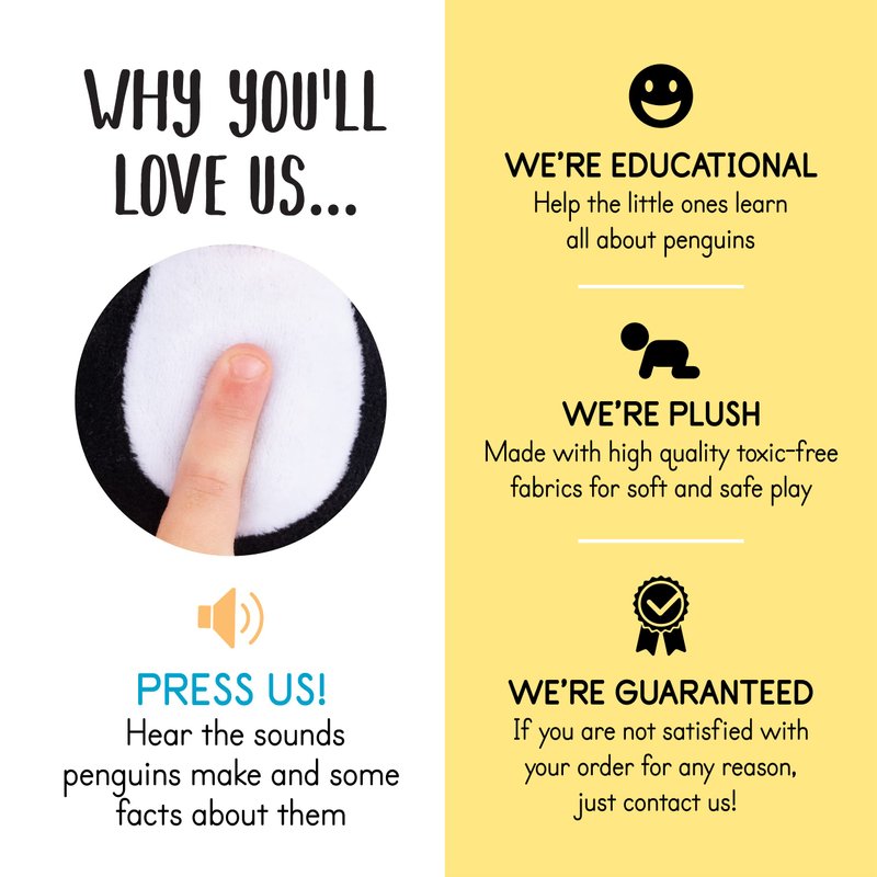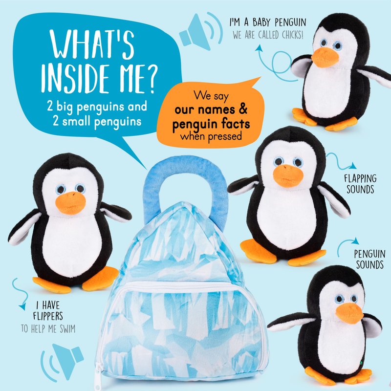 - 🧊 INTERACTIVE: Just squeeze or hug the super-soft plush penguin to hear a fun fact about them! Turn playtime into an enjoyable moment; promote fine motor skills, engage them in creative, pretend, and imaginative play! This, “My Penguins” set, is perfect for your kids, birthday parties, Christmas, classroom rewards, and carnival prizes! It’s an ideal holiday gift, party supply, and/or Christmas present for any plush toy lovers.