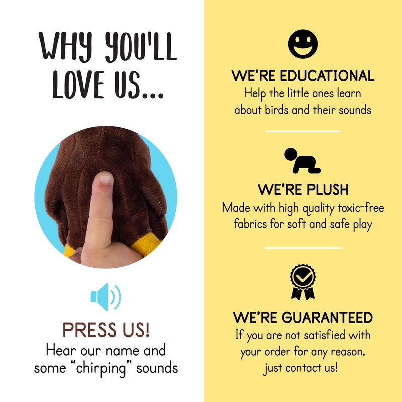 - 🦜QUALITY: All of the products at Plush Creations are made from the softest and highest quality non-toxic materials available in the industry! These soft plush Birds are 100% safe for your newborn infant, baby, or toddler. The plush stuffed animal toys are durable and can be washed with a damp cloth to keep it clean! Watch your little cuddlers laugh and smile from the sounds of these super adorable and feathery flying plush animals!