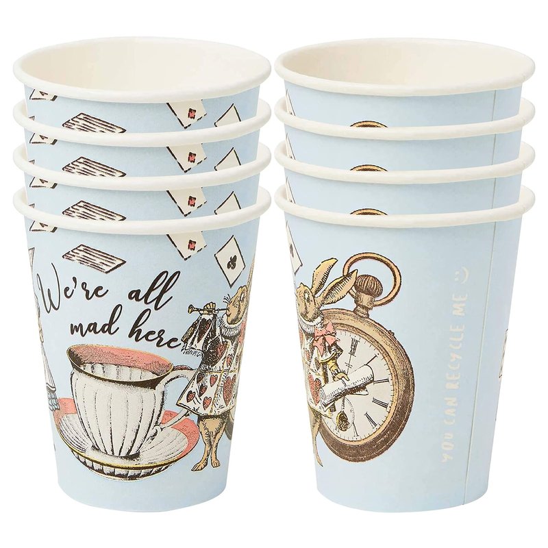 - Host your own Mad Hatter Tea Party with Talking Tables Alice in Wonderland Cups. These pretty paper cups are disposable, meaning there's no washing up or breakages! They also make for an eye-catching addition to your tea party tablescape!