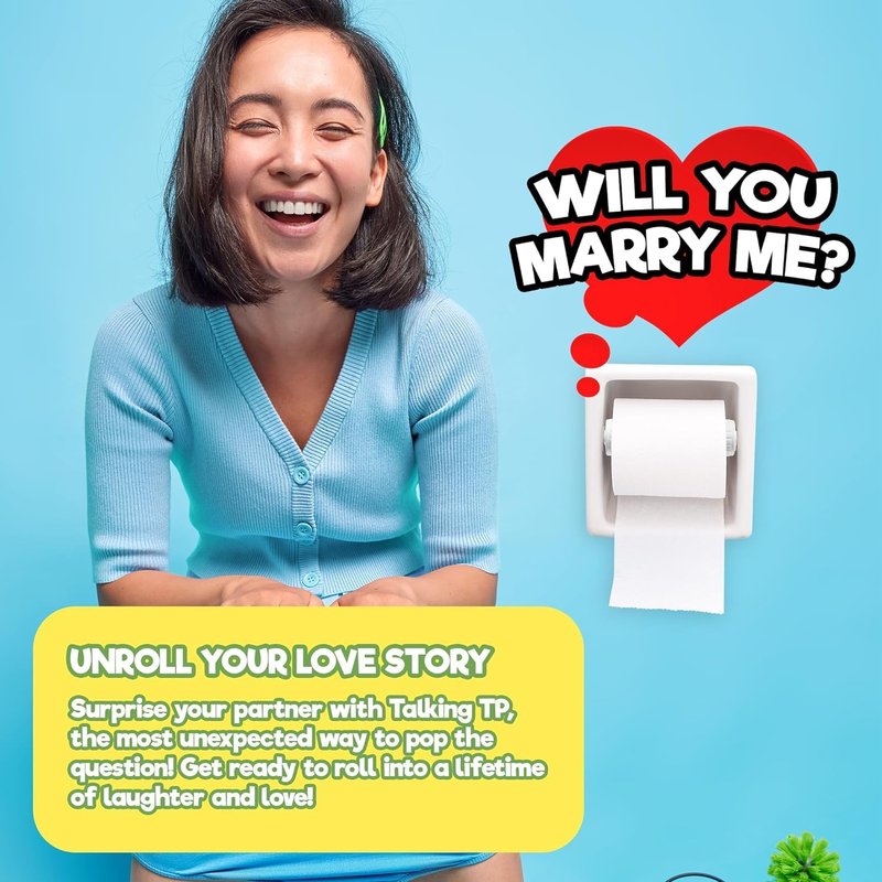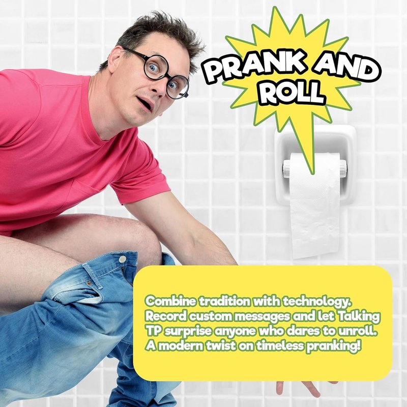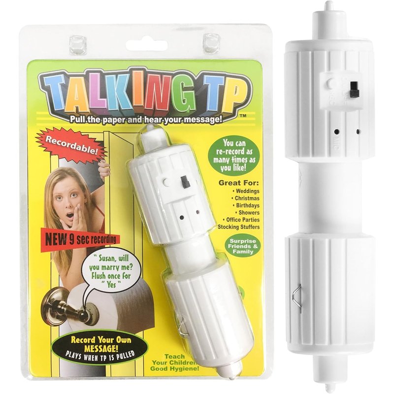 Surprise your family and friends with an unexpected bathroom message - turns an ordinary trip to the bathroom into a laugh filled surprise they'll never forget. Talking Toilet Paper allows you to record (and re-record) a message, music or sound and then have it automatically play back. The recording device is built into a spindle that fits inside a roll of toilet paper (and fits all holders and toilet paper rolls) so that every time the toilet paper "rolls," the recording is played! Simply turn on the unit and press the record button and record up to 6 seconds of sound. The device uses special technology to sense movement of the spindle, which automatically plays back the recording every time the unit moves.