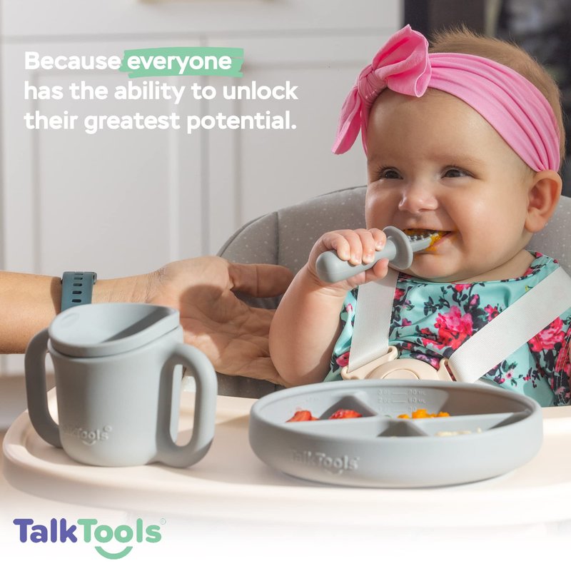 THE TALKTOOLS Itsy new all-inclusive feeding set comes with all the essential items you need in one convenient kit to facilitate this messy eating phase, reduce clean-up, and make meal time at home or on the go a breeze.
