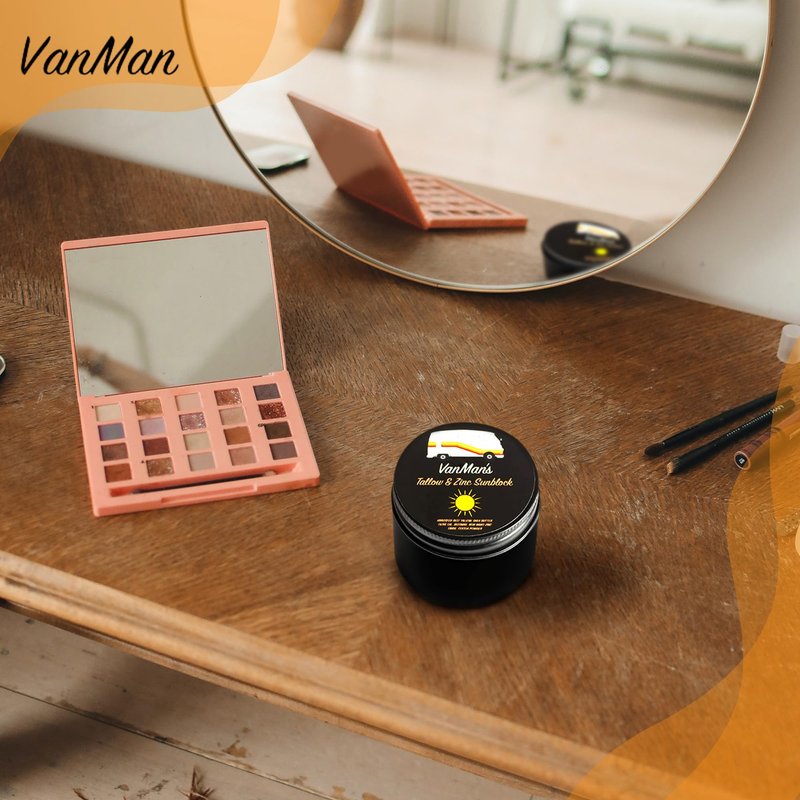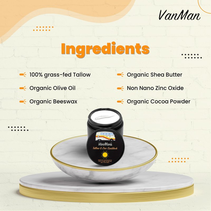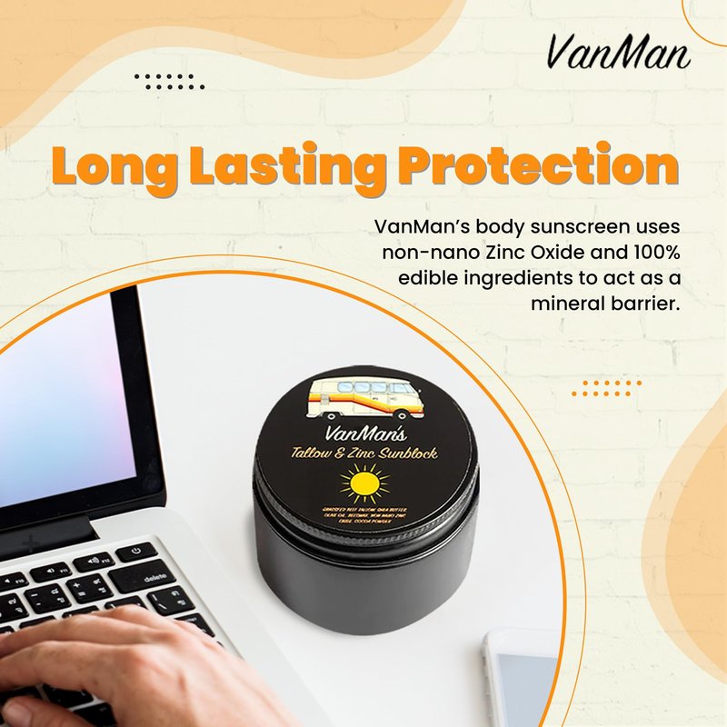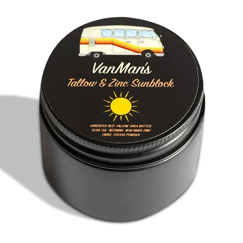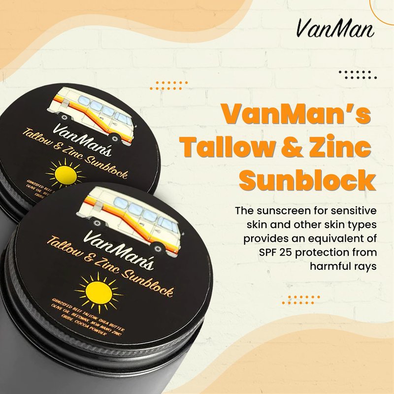VanMan's Sunblock for Face & Body (2 oz, Pack of 1): Experience the goodness of Tallow & Zinc in our SPF 25 travel sunscreen with zinc. VanMan’s Tallow & Zinc Sunblock, like all VanMan products, uses 100% edible ingredients. Change your skin to not burn by using our VanMan’s pack of 1, 2oz adults & kids sunscreen applicator for back, face, and body that uses non-nano Zinc Oxide to act as a mineral barrier. The sunscreen for sensitive skin and other skin types provides an equivalent of SPF 25 protection from harmful rays. This sunblock applicator for kids & adults is nearly 100% absorbent and water resistant leaving no white residue. Our sunblock SPF for face & body can be applied as a regular moisturizer. Leave it for a few minutes to absorb. Apply the zinc oxide sunscreen face again after heavy workouts or any other activity. — 1-Pack Zinc Sunscreen Face Full Ingredients: 100% grass-fed Tallow, Organic Olive Oil, Organic Beeswax, Organic Shea Butter, Non-Nano Zinc Oxide, & Organic Cocoa Powder. --- About Us: We are more than a natural remedies company. Together, we have created a movement with an anti-big pharma message, using our knowledge of holistic health and inspired, soulful remedies that speak beyond the confines of analytics, studies, and “science”.