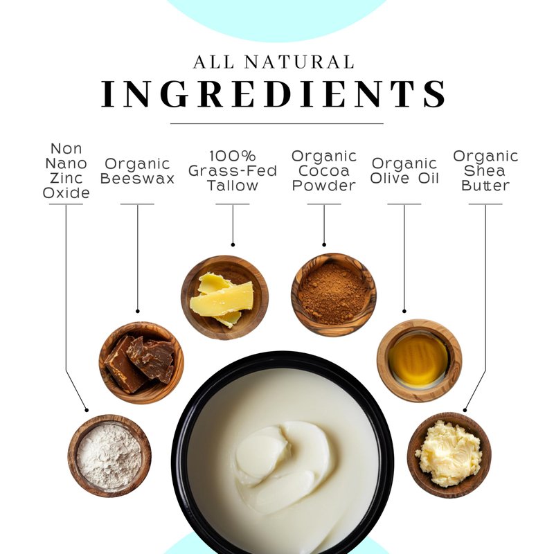 - Skin Loving Ingredients: This daily face sunscreen with zinc oxide uses 100% edible ingredients and absorbs in a few minutes. The zinc oxide facial sunscreens are packed with 100% grass-fed tallow, organic olive oil, organic beeswax, organic shea butter, & organic cocoa powder.