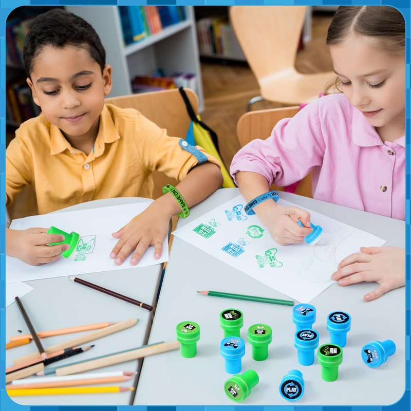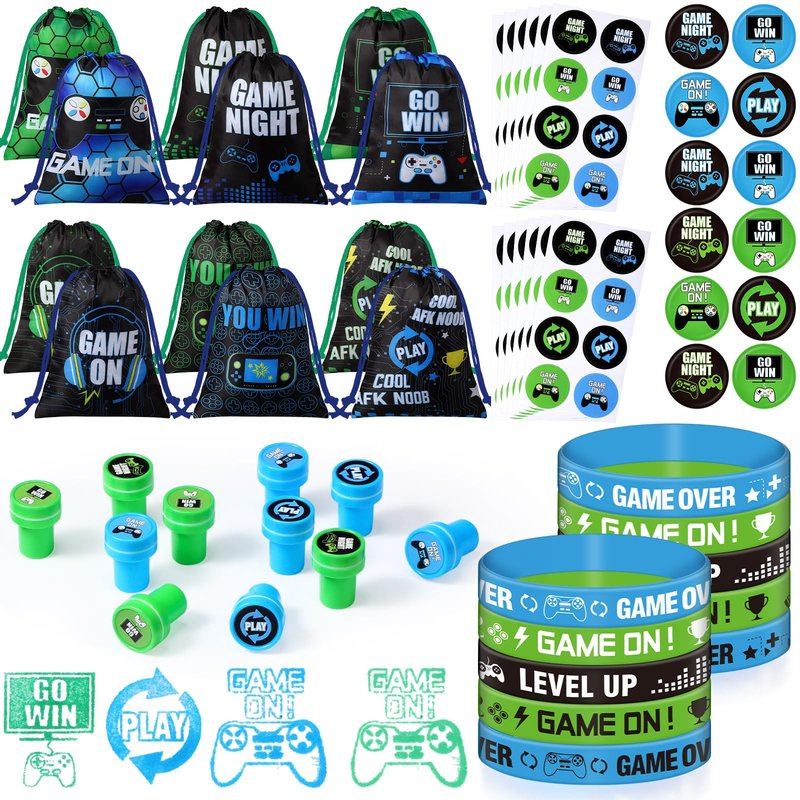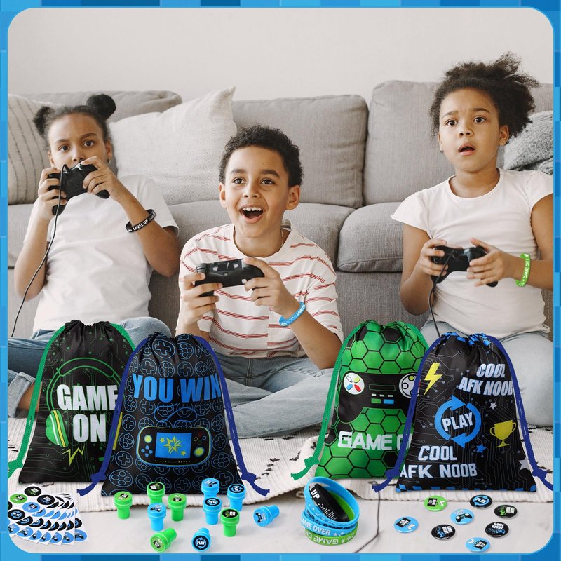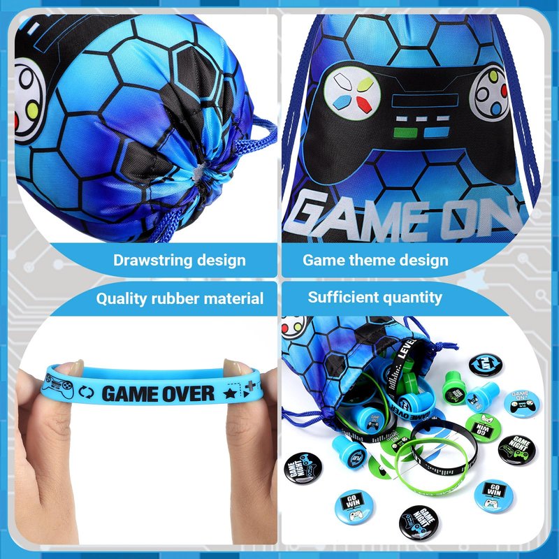 - Packing List: you will receive 60 pieces of game party supplies, including 12 game party favor bags, 12 game wristbands, 12 stamps, 12 button pins and 12 sheets game stickers; Sufficient quantity to meet your daily use and party needs