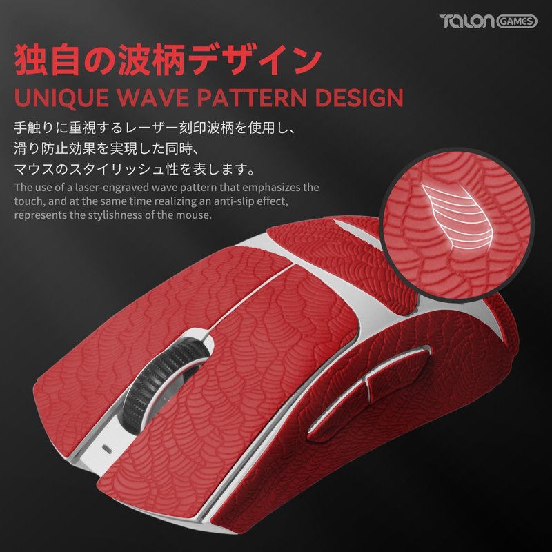 - [New pattern mouse grip tape] Based on TALONGAMES mouse grip tape, grip strength is greatly enhanced, providing high friction, flexibility and excellent grip comfort. At the same time as using a unique laser-engraved waves pattern on the surface, it is also blended with a unique color fading prevention technology to prevent fading. And from eight colors. You can choose freely according to your needs.