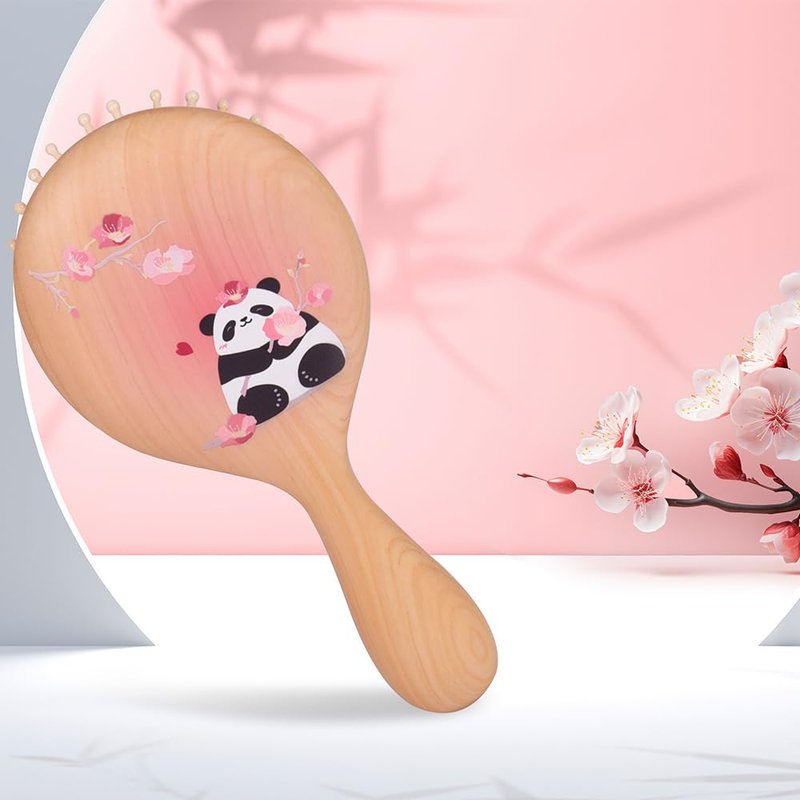 Features + Hand-crafted and painted to ensure quality and one of a kind hair brush. + Easy maintenance! Simply rinse this hair brush under cold water and allow to air dry. + Static free product. + Wooden bristles help to massage the scalp and distribute natural oils thoroughly revealing nourished hair. Say goodbye to flyaways! + Suitable for all hair types and may be used on dry or wet locks. Pattern Design A panda is sitting under the peach tree. Peach flowers dance in the wind. Pink cushion design hits many girls.