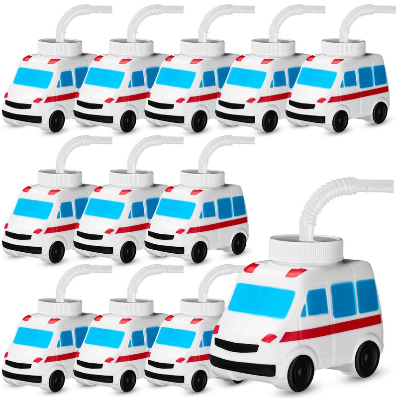 - 12 Sets Ambulance Truck Cups: you will receive 12 pieces of ambulance truck drink cups and 12 pieces of straws, which is a nice combination set for kids birthday party favors or gifts and suitable for car theme party; Sufficient quantity to meet your various needs and share with your partners