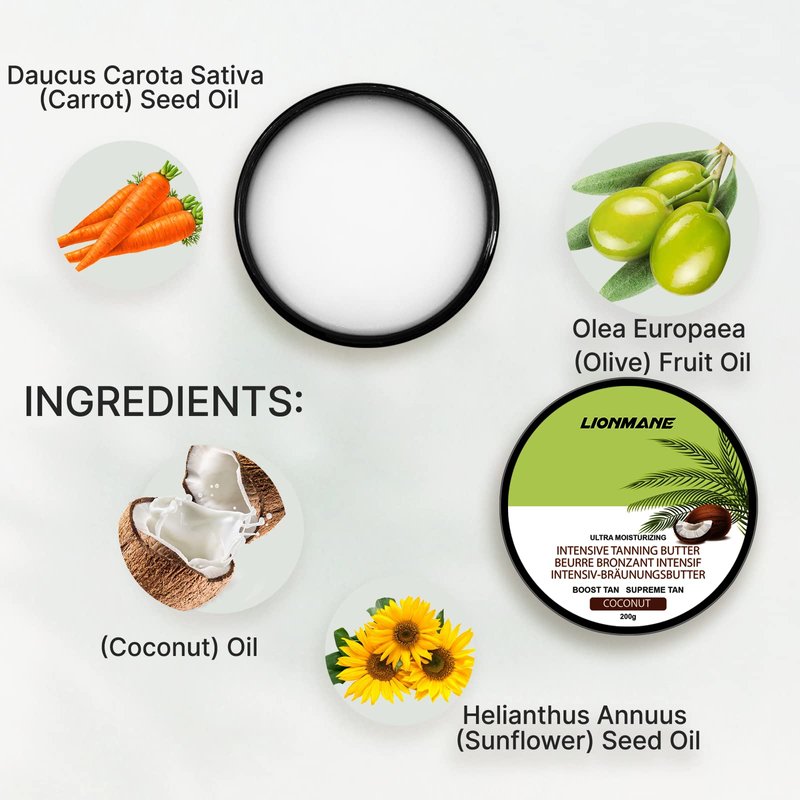 √ WHAT’S INSIDE Everything your skin needs for the perfect bronze. * 100% natural ingredients. For sun-ready and strengthened skin Extra virgin coconut oil to boost your tan And Vitamin for radiant and replenished skin. √ DIRECTIONS: ❣ Apply evenly an abundant quantity over the entire body and reapply frequently, especially after swimming, toweling & perspiring. Strictly avoid the eye area. ❣ This product does not provide UV protection. We don’t recommend you use this product on children or people with sensitive skin. ❣ For people with very light skin, we recommend using SPF before applying our tanning butter. ❣ Avoid direct sun exposure between 11 a.m. and 4 p.m.
