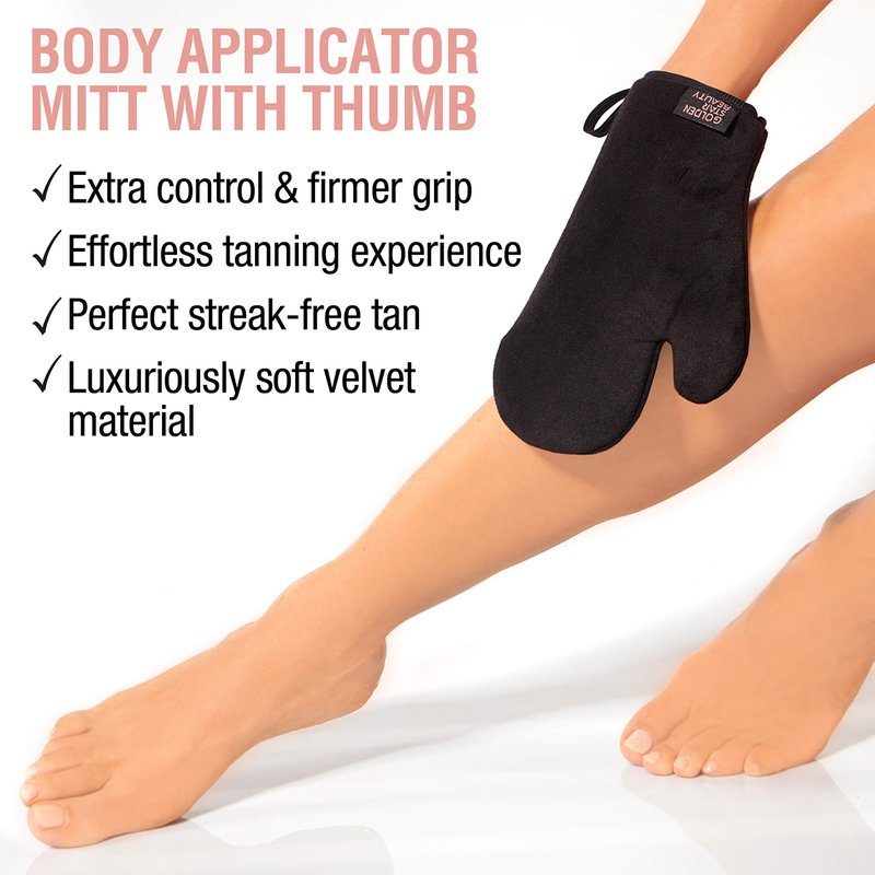 - Complete Kit: This set comprises an exfoliation mitt, a body application mitt with thumb, and a mini mitt for detailed work. Conveniently stored in a versatile toiletry bag, perfect for travel. Achieve flawless tans on the go!