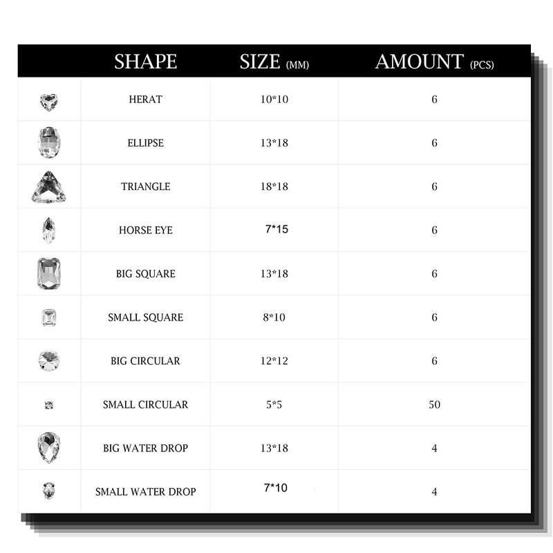 - SIZE&COLOR:There are 10 colors for choosing.Each shape of glass rhinestone has different sizes. Small square:8*10mm,Big square:13*18mm,Ellipse:13*18mm,Heart:10*10mm,Triangle:18*18mm,Horse eye:7*15mm,Small circular:5*5mm,Big circular:12*12mm,Small water drop:7*10mm,Big water drop:13*18mm