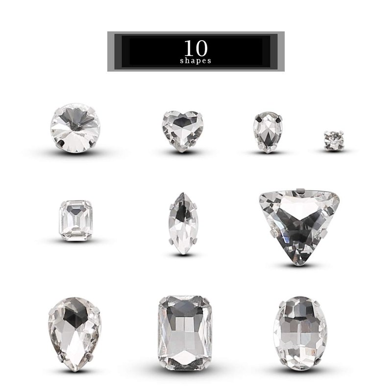 - QUANTITY&SHAPE:Every package includes 100 pcs rhinestones in sewing on setting.6×small square,6×big square,6×ellipse,6×heart,6×triangle,6×horse eye,6× big circular,4×small water drop,4×big water drop,50×small circular.
