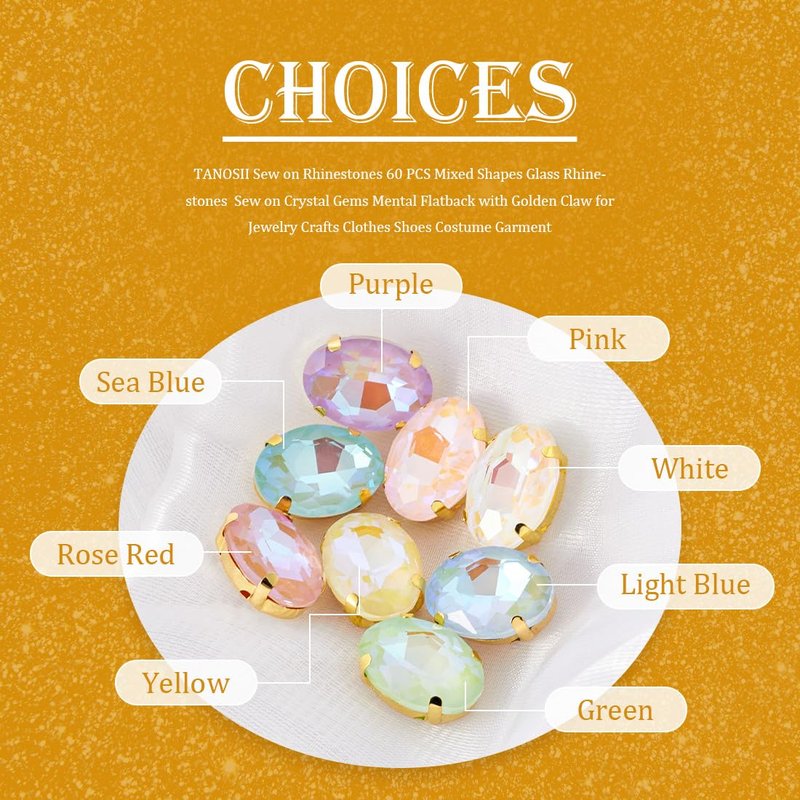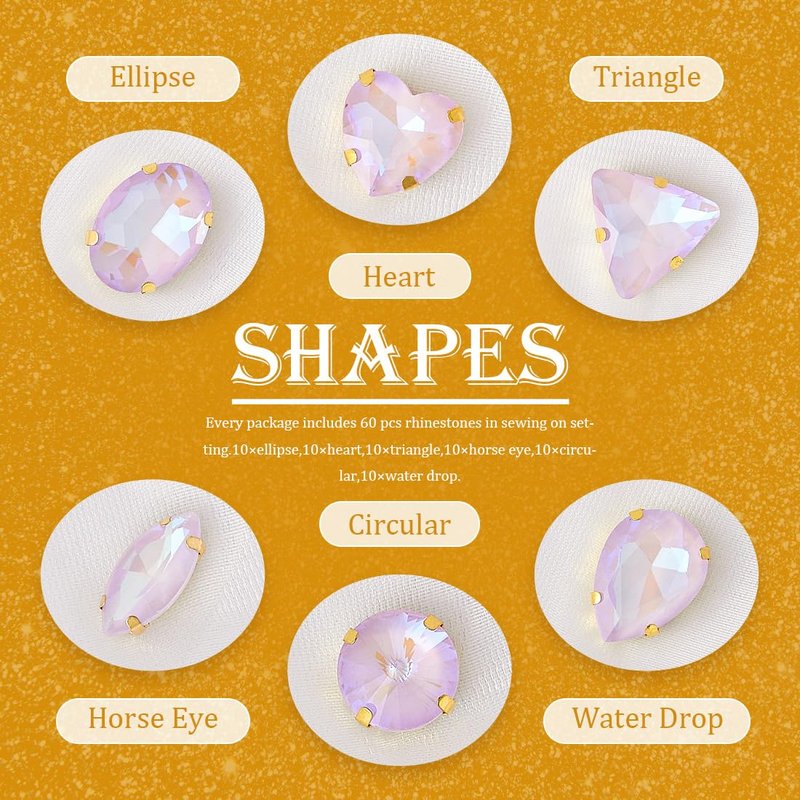 - QUANTITY&SHAPE:Every package includes 60 pcs rhinestones in sewing on setting.10×ellipse,10×heart,10×triangle,10×horse eye,10×circular,10×water drop.