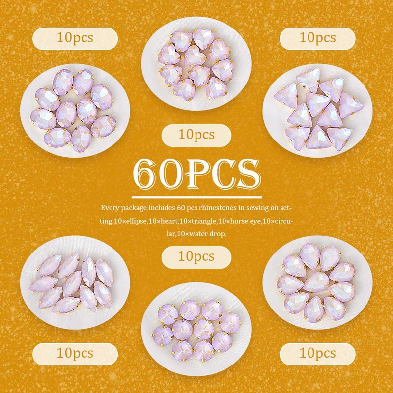 Quantity:Every package includes 60 pcs rhinestones in sewing on setting.10×ellipse,10×heart,10×triangle,10×horse eye,10×circular,10×water drop.