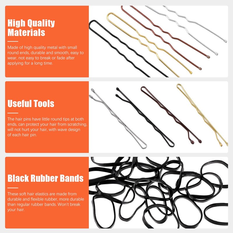 - 💜[Nice Additions] 100pcs black rubber bands are included in the package, made of premium rubber, durable, flexible, not easy to break. Besides, all bobby hair pins, u-shape pins, rubber bands are packed separately in a transparent box with grids according to different colors and types.
