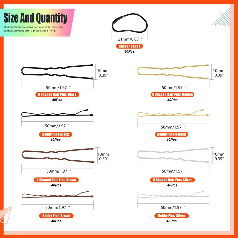 - 💜[Package Includes] You'll get 40pcs gold bobby pins, 40pcs silver bobby pins, 40pcs black bobby pins, 40pcs brown bobby pins, 40pcs gold u-shape pins, 40pcs silver u-shape pins, 40pcs black u-shape pins, 40pcs brown u-shape pins, 100pcs black rubber bands, total of 420pcs, which can meet your needs of daily use.