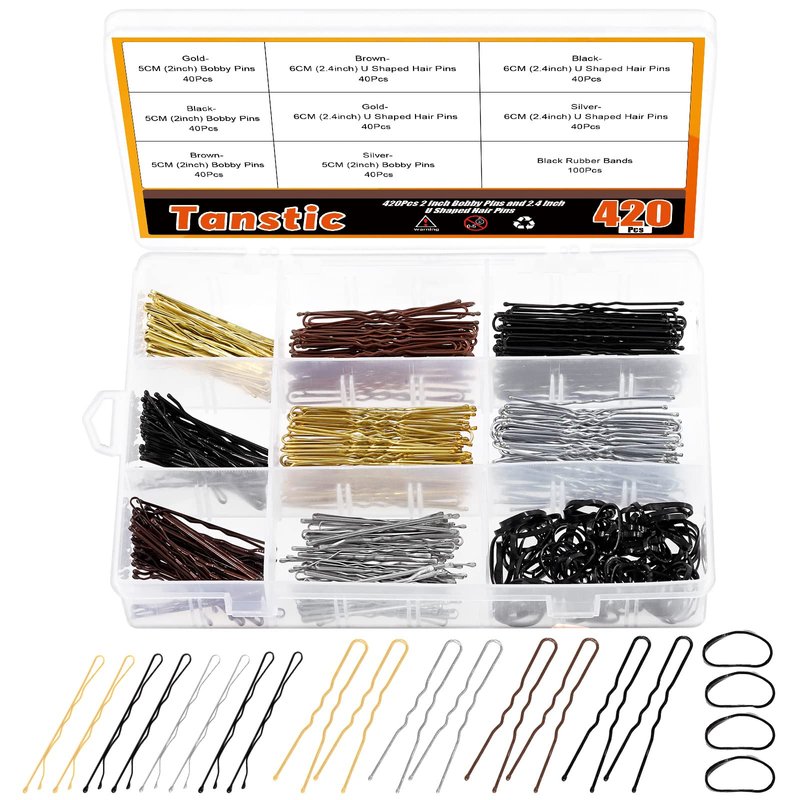 Tanstic 420Pcs 4 Colors 2 Inch Bobby Pins and 2.4 Inch U Shaped Hair Pins with Black Rubber Bands Kit, Hair Pins Hairpins Bun Pins Soft Elastic Bands with Storage Case (Gold/Silver/Black/Brown)