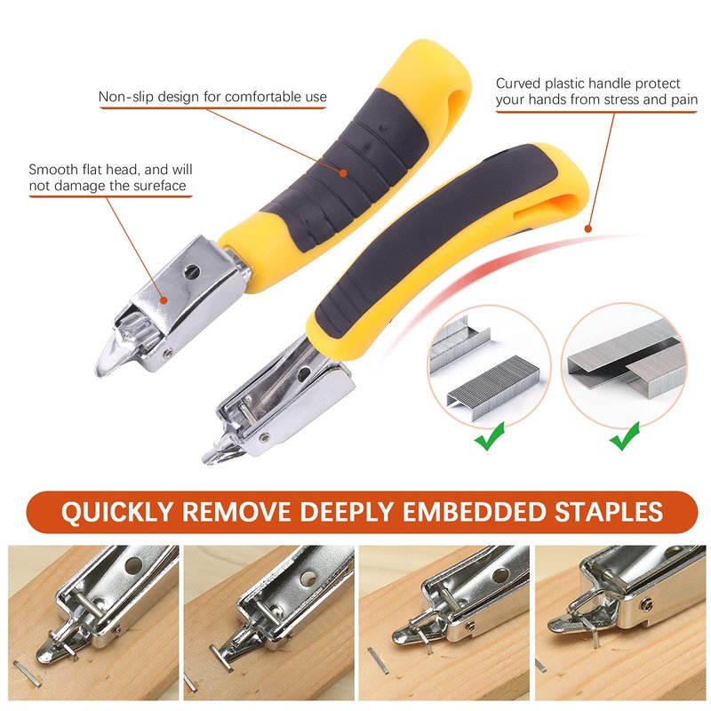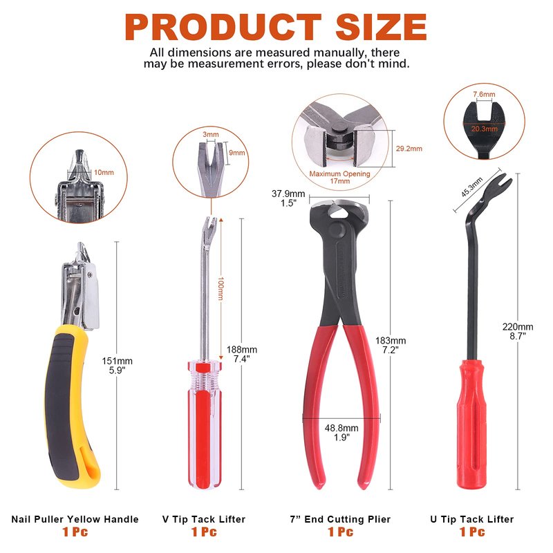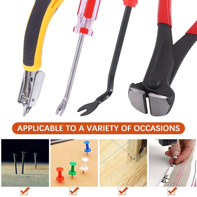 - 【Practical Package】Tanstic 4Pcs Staple Remover Tool Set includes 1pc end cutting pliers, 1pc V tip tack puller, 1pc U-type tack puller and 1pc staple remover. 4pcs package in 4 different types can fully meet your daily upholstery needs.