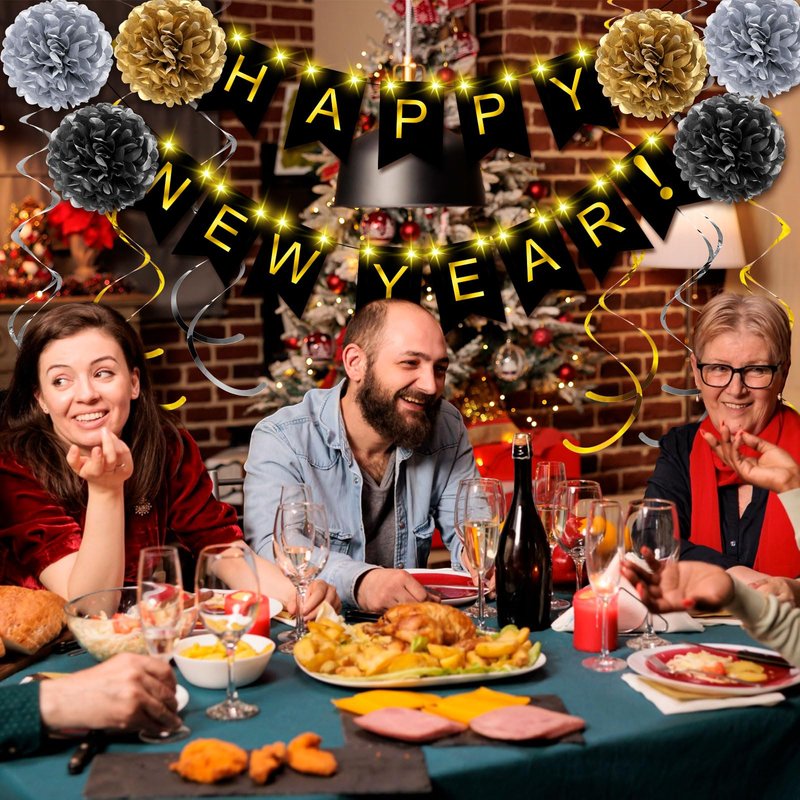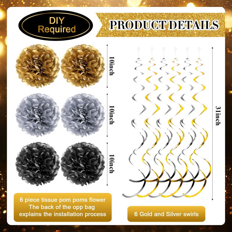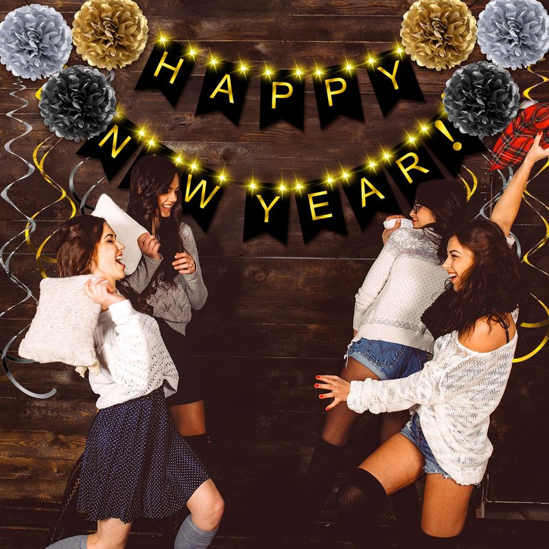 - Package Include: simplify your New Year's Eve party planning with our comprehensive pack; It includes 1 Happy New Year banner, 6 poms 2 gold 2 silver 2 black (DIY required), 6 swirly garlands 3 gold 3 silver, and 2 light string with 2 flashing modes; With thing in one convenient package, setting up is quick and effortless