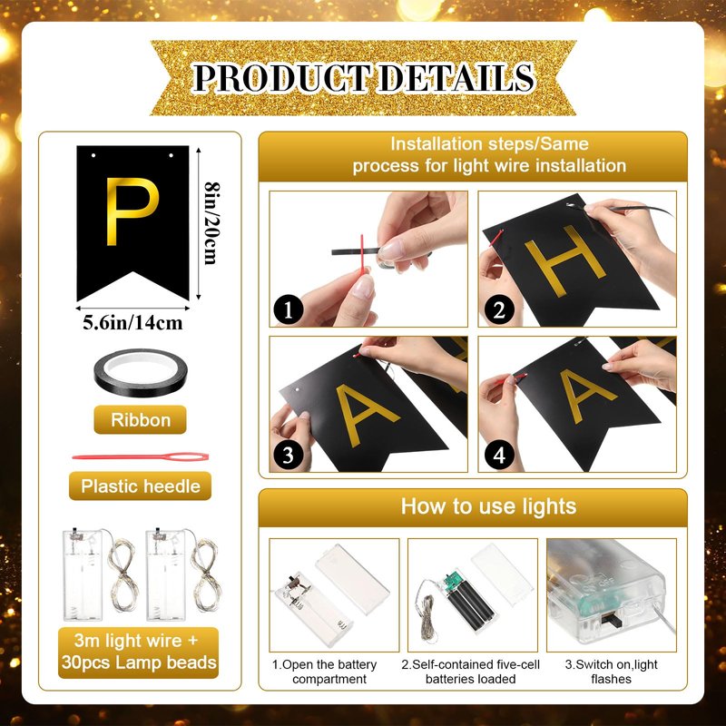- DIY Your New Year Decor: unleash your creativity with our New Year's Eve party supplies; The banners, poms, and garlands can be arranged in number of ways to create the decor that is uniquely yours; The opp bag comes with installation steps; There are small holes on the banner, the light wires can be attached easily
