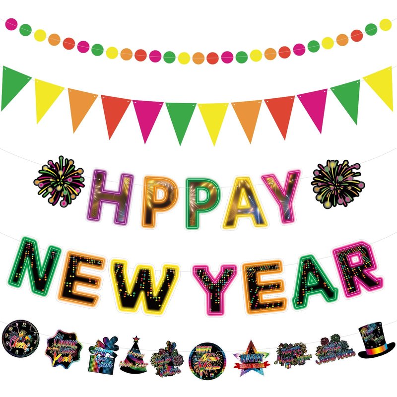 TaoBary 5 Pcs Happy New Year Banner Neon Happy New Year Garland Banner Glow in the Dark New Years Eve Party Decorations Neon Glow Party Supplies for 2025 New Year Party