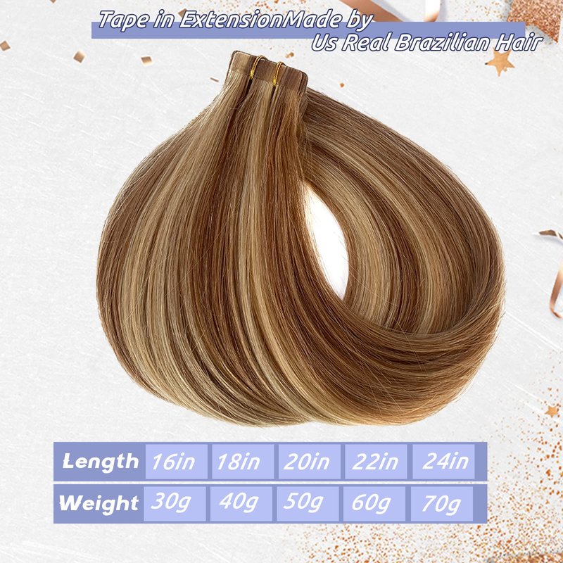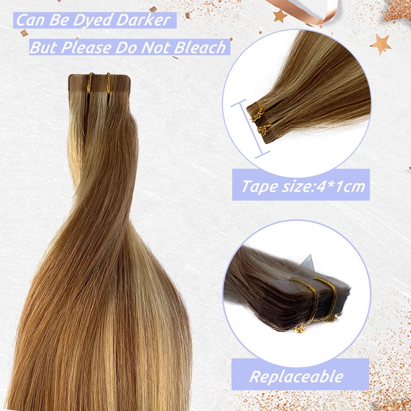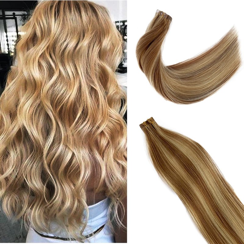 Tape in Golden Brown Hair with Blonde Mixed Real Hair Highlights Human Remy Hair Extensions Silky Straight Seamless Skin Weft 18" 20Pcs/40Grams Invisble Tape on Glue in Extensions